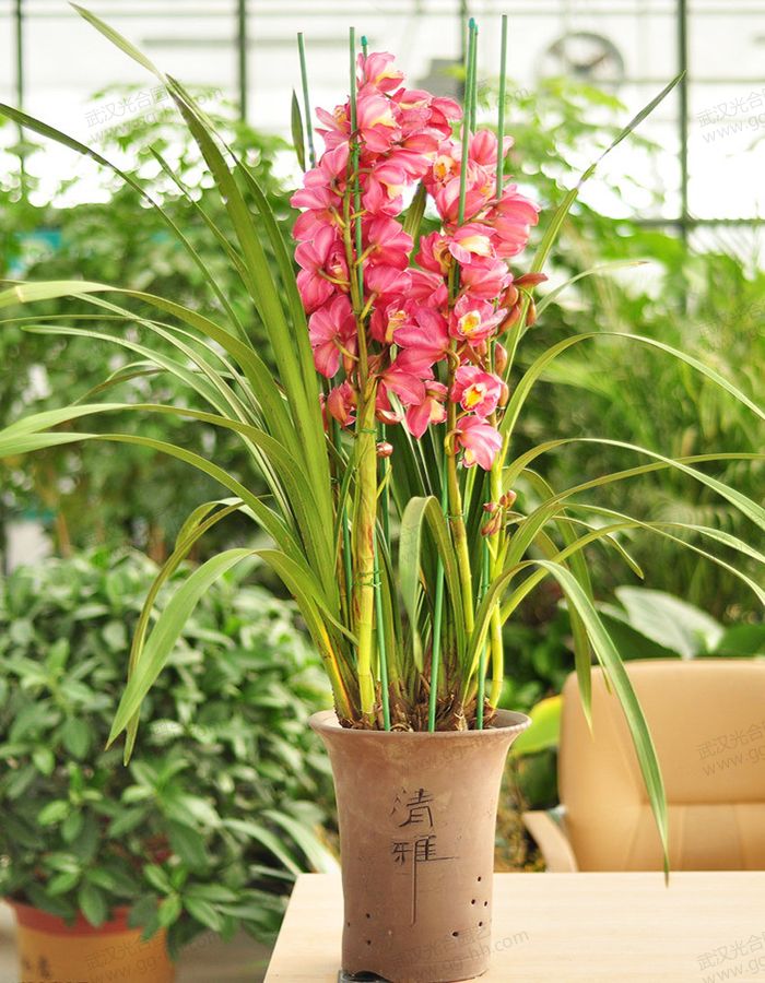 形态:大花蕙兰为多年生兰科类草本植物,是武汉地区较为常见的室内绿植租赁品类。其叶片细长飘逸,花朵有红、黄、紫等多种颜色。
